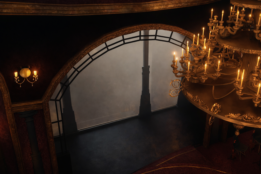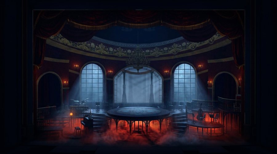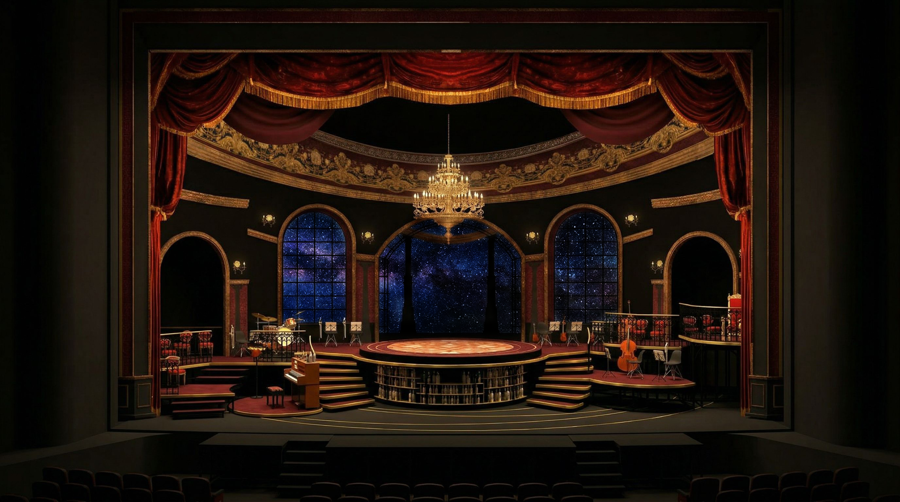 音乐会版舞美设计王石青保留创制版部分视觉元素,并以“彗星轨迹”为核心理念,运用上下两层的双层舞台设计暗示故事内外的时代声响,使空间的对照成为叙事本身。
