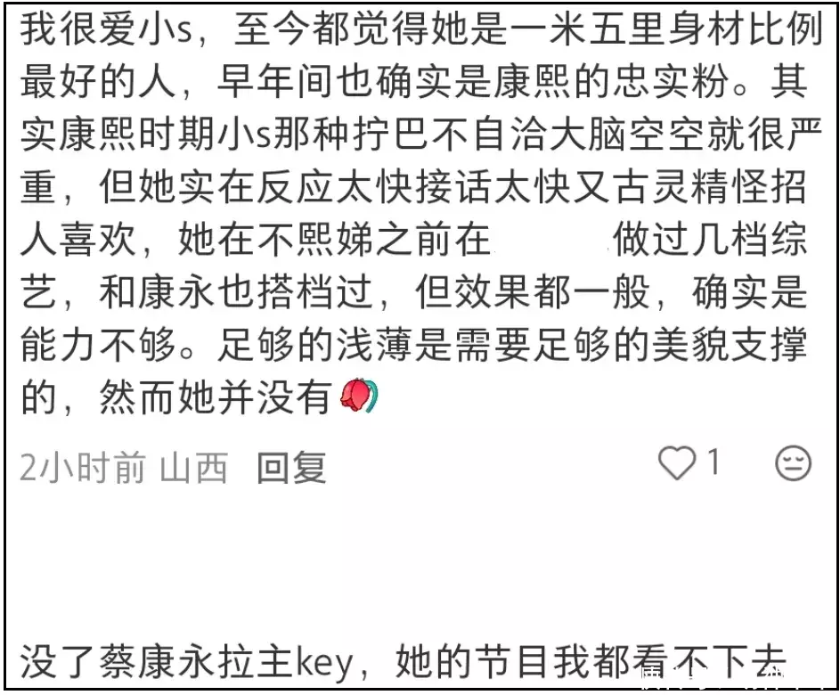 眼见着小S复出之后状态更差了,业内都觉得心情复杂,表示不知道这是小S能拿出来的最好状态,还是小S根本没意识到自己状态差,不管是前者还是后者,都让人有些不能接受。