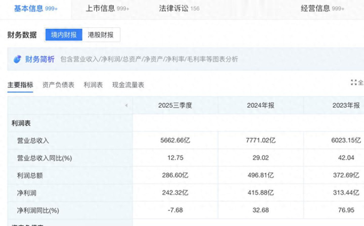 其中第三季度,营收为1949.85亿元,同比下降3.05%;净利润为78.23亿元,同比下降32.60%。