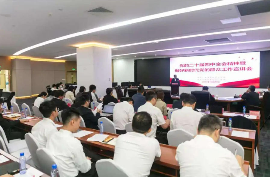 调研组召开学习贯彻党的二十届四中全会精神暨走好新时代党的群众路线宣讲会,广东省委党校党的建设教研部主任、教授梁道刚作学习宣讲,省、市党的社会工作部门相关负责同志以及专家学者、媒体记者一起深入讨论。